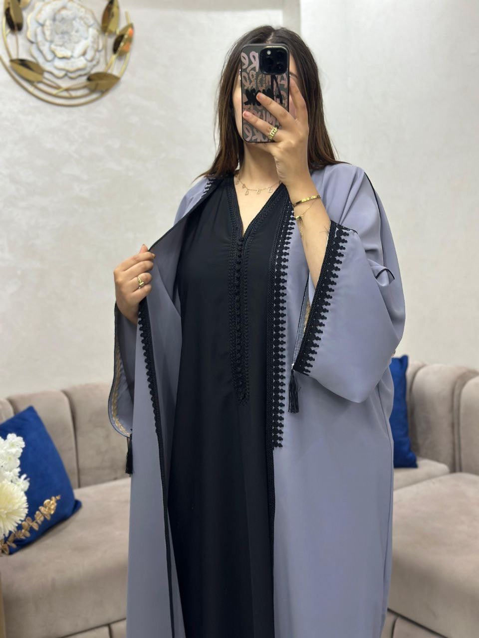 Il se compose d’une robe sans manches noire en crêpe de soie, accompagnée d’un kimono sublimé par un zwak lam3alam travaillé avec minutie.